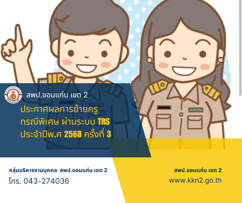 KK2 NEWS ข่าว บริหารงานบุคคล ย้ายบรรจุแต่งตั้ง ประกาศผลการย้ายครู (กรณีพิเศษ) ผ่านระบบ TRS ประจำปีพ.ศ 2568 ครั้งที่ 3 วัลลภ วระไว 27 พฤศจิกายน 2025 0 ประกาศผลการพิจารณาการย้ายข้าราชการครูและ […]