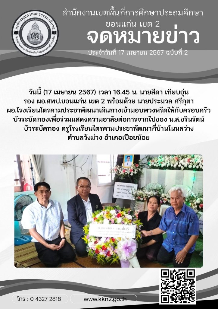 นายสีดา เทียบอุ่น รอง ผอ.สพป.ขอนแก่น เขต 2 พร้อมด้วย นายประมวล ศรีกุตา ผอ.โรงเรียนไตรคามประชาพัฒนาเดินทางเข้ามอบพวงหรีดให้กับครอบครัวบัวระบัดทองเพื่อร่วมแสดงความอาลัยต่อการจากไปของ น.ส.ชรินรัตน์ บัวระบัดทอง