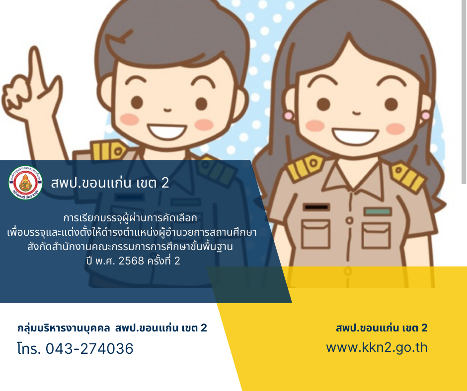 >>>การเรียกบรรจุผู้ผ่านการคัดเลือกเพื่อบรรจุและแต่งตั้งให้ดำรงตำแหน่งผู้อำนวยการสถานศึกษา สังกัดสำนักงานคณะกรรมการการศึกษาขั้นพื้นฐาน ปี พ.ศ. 2568 ครั้งที่ 2