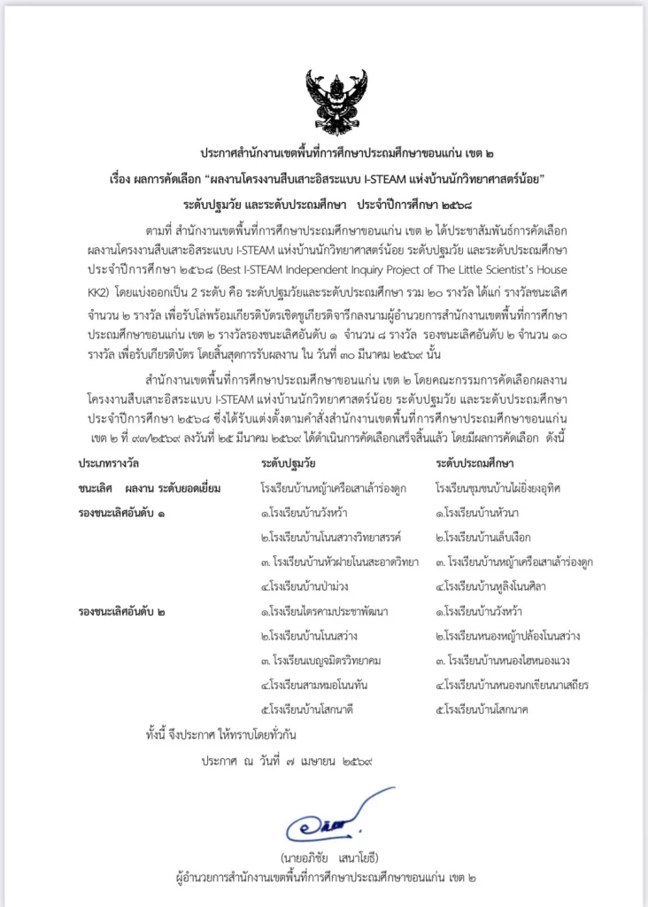 สำนักงานเขตพื้นที่การศึกษาประถมศึกษาขอนแก่น เขต 2 โดยคณะกรรมการคัดเลือกผลงานโครงงานสืบเสาะอิสระแบบ I-STEAM แห่งบ้านนักวิทยาศาสตร์น้อย ระดับปฐมวัย และระดับประถมศึกษา ประจำปีการศึกษา 2568 ซึ่งได้รับแต่งตั้งตามคำสั่งสำนักงานเขตพื้นที่การศึกษาประถมศึกษาขอนแก่น เขต 2 ที่ 93/2569 ลงวันที่ 25 มีนาคม 2569 ได้ดำเนินการคัดเลือกเสร็จสิ้นแล้ว โดยมีผลการคัดเลือก ดังนี้