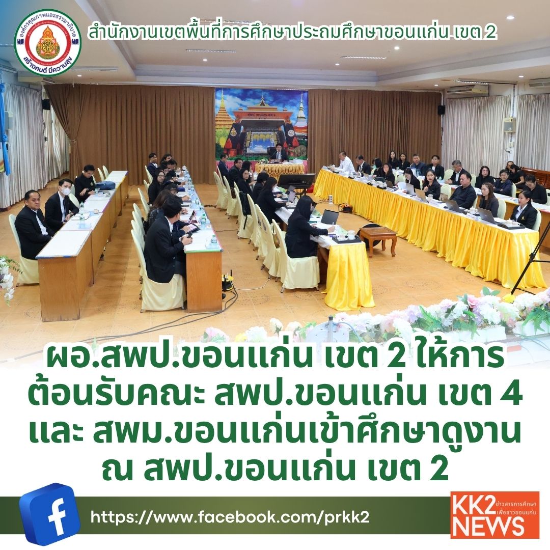 (18 พฤศจิกายน 2568) นายอภิชัย เสนาโยธี ผู้อำนวยการสำนักงานเขตพื้นที่การศึกษาประถมศึกษาขอนแก่น เขต 2 (ผอ.สพป.ขอนแก่น เขต 2) ให้การต้อนรับ ดร.วิโรจน์ ค้อไผ่ ผอ.สพป.ขอนแก่น เขต 4 พร้อมด้วยผู้บริหาร และบุคลากรในสังกัด สพป.ขอนแก่น เขต 4 และบุคลากรจาก สำนักงานเขตพื้นที่การศึกษามัธยมศึกษาขอนแก่น (สพม.ขอนแก่น ) เข้าศึกษาดูงานการประชุมสรุปผลการดำเนินการพัฒนาคุณภาพการบริหารและการจัดการศึกษา ประจำปี 2568 โดยมี นายโอวาท อดทน นายเชาวรินทร์ แก้วพรม รอง ผอ.สพป.ขอนแก่น เขต 2 ผู้อำนวยการทุกกลุ่มงาน คณะศึกษานิเทศก์ร่วมให้การต้อนรับ ณ ห้องประชุมศูนย์การเรียนรู้ตลอดชีวิต สพป.ขอนแก่น เขต 2