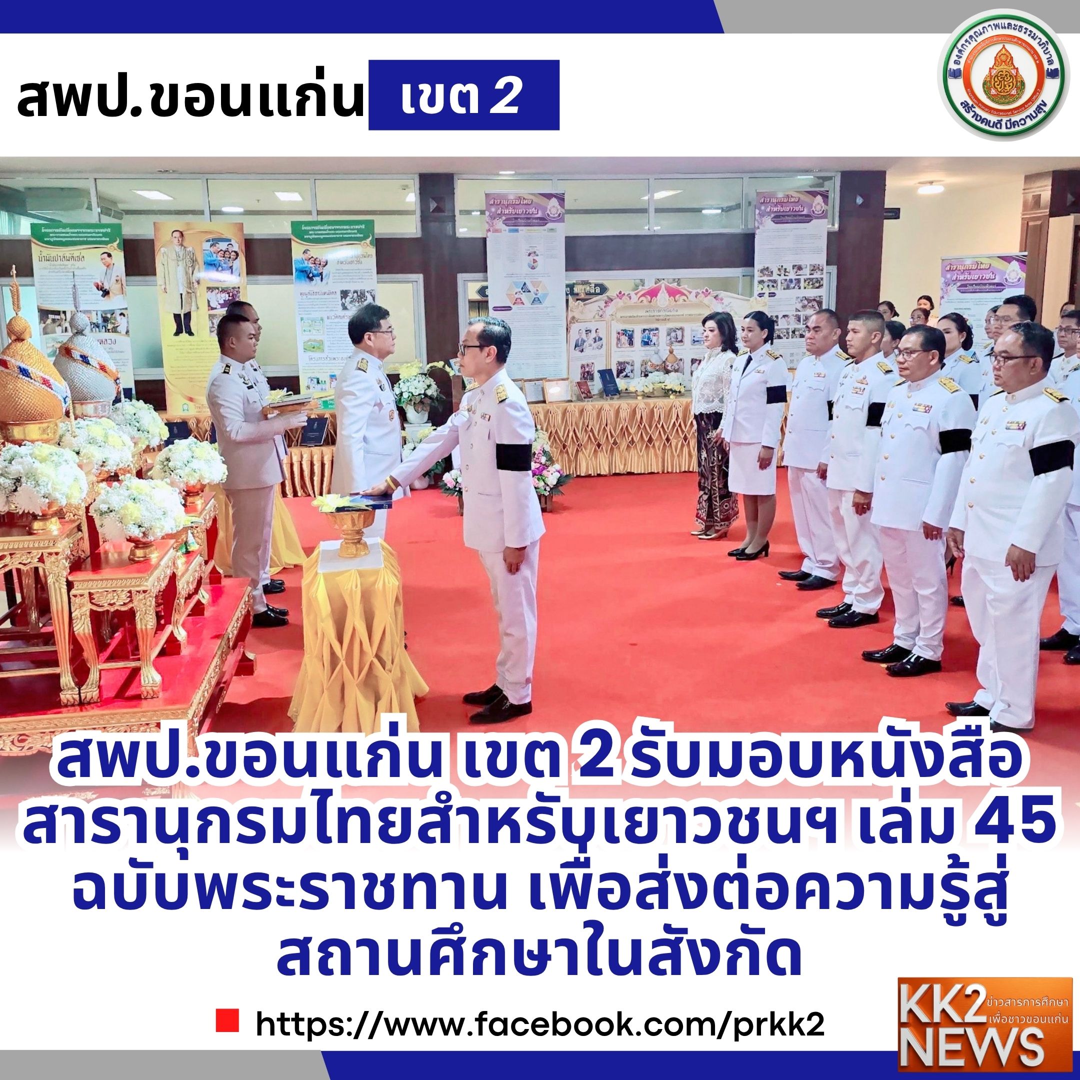 วันนี้ (2 เมษายน 2569) เวลา 09.00 น. นายอภิชัย เสนาโยธี ผู้อำนวยการสำนักงานเขตพื้นที่การศึกษาประถมศึกษาขอนแก่น เขต 2 (ผอ.สพป.ขอนแก่น เขต 2) มอบหมายให้ นายเชาวรินทร์ แก้วพรม รอง ผอ.สพป.ขอนแก่น เขต 2 พร้อมด้วย น.ส.ปนัดดา จันตะคุณ ศึกษานิเทศก์ชำนาญการพิเศษ และ นายทรงวุฒิ เดชมาลา ศึกษานิเทศก์ชำนาญการ รับมอบหนังสือสารานุกรมไทยสำหรับเยาวชน โดยพระราชประสงค์ในพระบาทสมเด็จพระบรมชนกาธิเบศร มหาภูมิพลอดุลยเดชมหาราช บรมนาถบพิตร เล่ม 45 ฉบับพระราชทาน ให้แก่สถานศึกษาในจังหวัดขอนแก่น โดยมี นายขจรเกียรติ รักพานิชมณี ผู้ว่าราชการจังหวัดขอนแก่นเป็นประธานในพิธีฯ ณ บริเวณหน้าห้องประชุมแก่นเมือง ศาลากลางจังหวัดขอนแก่น (หลังใหม่) ชั้น 1