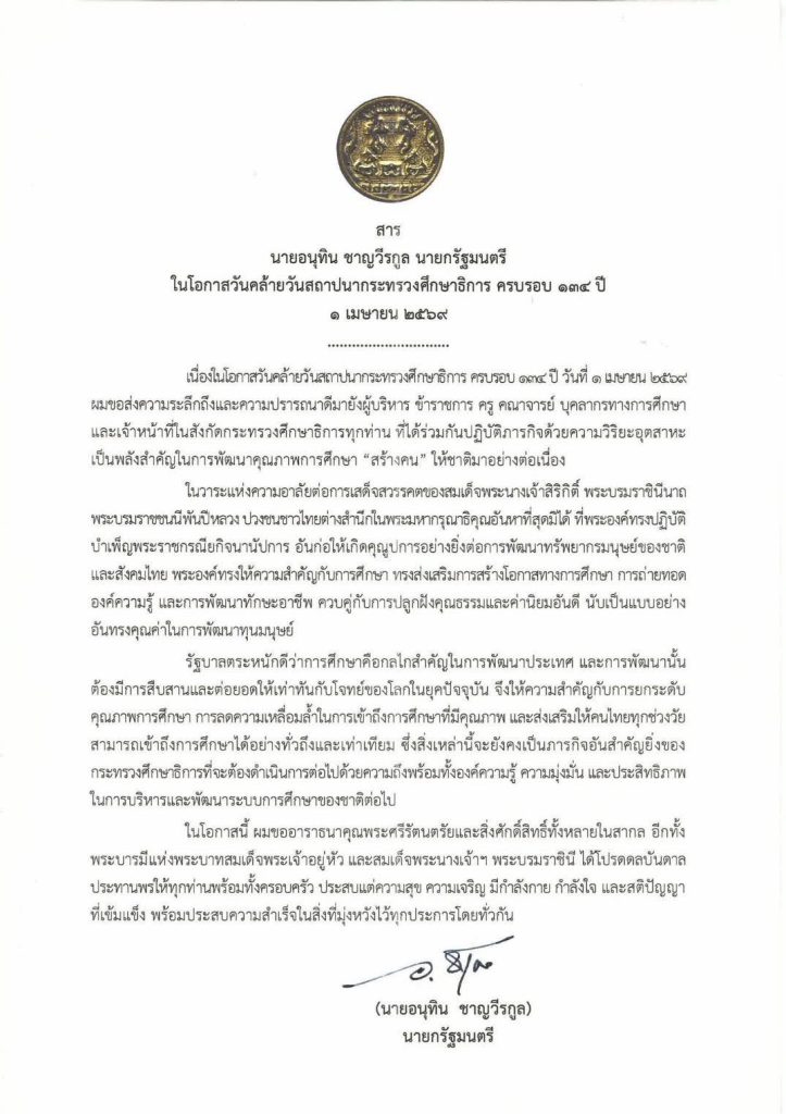 สาร นายอนุทิน ชาญวีรกูล นายกรัฐมนตรี ในโอกาสวันคล้ายวันสถาปนากระทรวงศึกษาธิการ ครบรอบ 134 ปี 1 เมษายน 2569