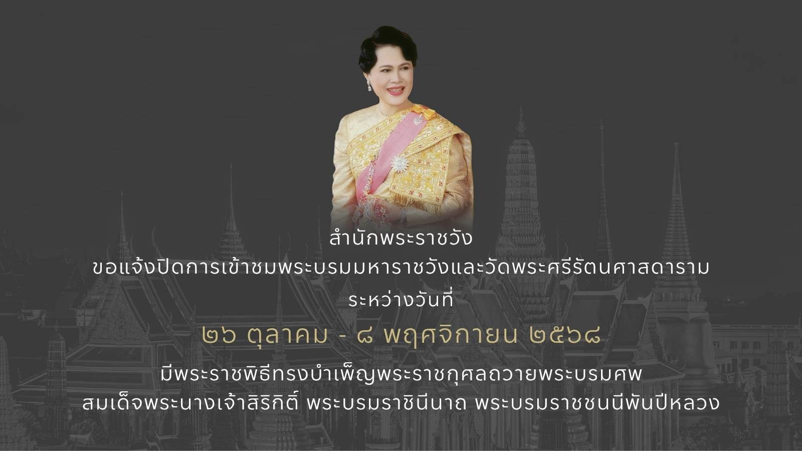 สำนักพระราชวัง ขอแจ้งปิดการเข้าชมพระบรมมหาราชวังและวัดพระศรีรัตนศาสดารามระหว่างวันที่ 26 ตุลาคม – 8 พฤศจิกายน 2568 เนื่องจากมีพระราชพิธีทรงบำเพ็ญพระราชกุศลถวายพระบรมศพ สมเด็จพระนางเจ้าสิริกิติ์ พระบรมราชินีนาถ พระบรมราชชนนีพันปีหลวง