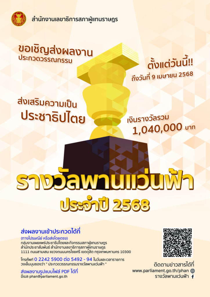 การประกวดวรรณกรรมรางวัลพานแว่นฟ้า ประจำปี 2568การประกวดวรรณกรรมรางวัลพานแว่นตาฟ้า ประจำปี 2568 ประเภทเรื่องสั้นและบทกวีเพื่อส่งเสริมความเป็นประชาธิปไตย โดยเปิดรับผลงานเข้าประกวดฯ ตั้งแต่บัดนี้ ถึงวันที่ 9 เมษายน 2568การประกวดวรรณกรรมรางวัลพานแว่นฟ้า ประจำปี 2568
