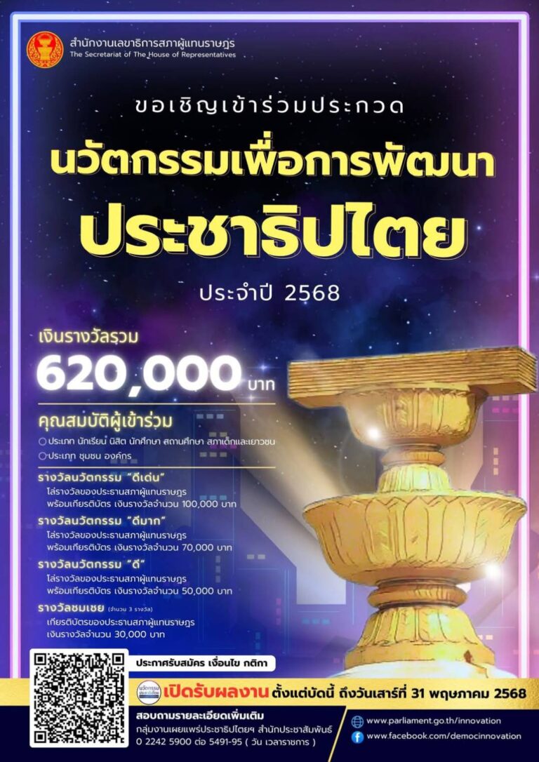 ข่าวประชาสัมพันธ์ภายนอก ขอเชิญเข้าร่วมโครงการประกวดนวัตกรรมประชาธิปไยเพื่อพัฒนาประชาธิปไตยเชิงคุณภาพ ประจำปี 256829 มกราคม 2568