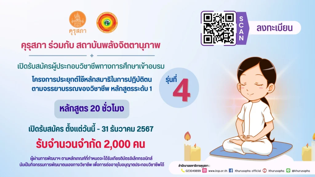 การรับสมัครผู้ประกอบวิชาชีพทางการศึกษาเข้าร่วมโครงการประยุกต์ใช้หลักสมาธิในการฏิบัติตนตามจรรยาบรรณของวิชาชีพคุรุสภาร่วมกับสถาบันพลังจิตตานุภาพ เปิดรับสมัครผู้ประกอบวิชาชีพทางการศึกษาเข้าอบรมโครงการประยุกต์ใช้หลักสมาธิในการปฏิบัติตนตามจรรยาบรรณของวิชาชีพ หลักสูตรระดับ 1 รุ่นที่ 4 รับสมัครตั้งแต่บัดนี้ถึงวันที่ 31 ธันวาคม 2567การรับสมัครผู้ประกอบวิชาชีพทางการศึกษาเข้าร่วมโครงการประยุกต์ใช้หลักสมาธิในการฏิบัติตนตามจรรยาบรรณของวิชาชีพ