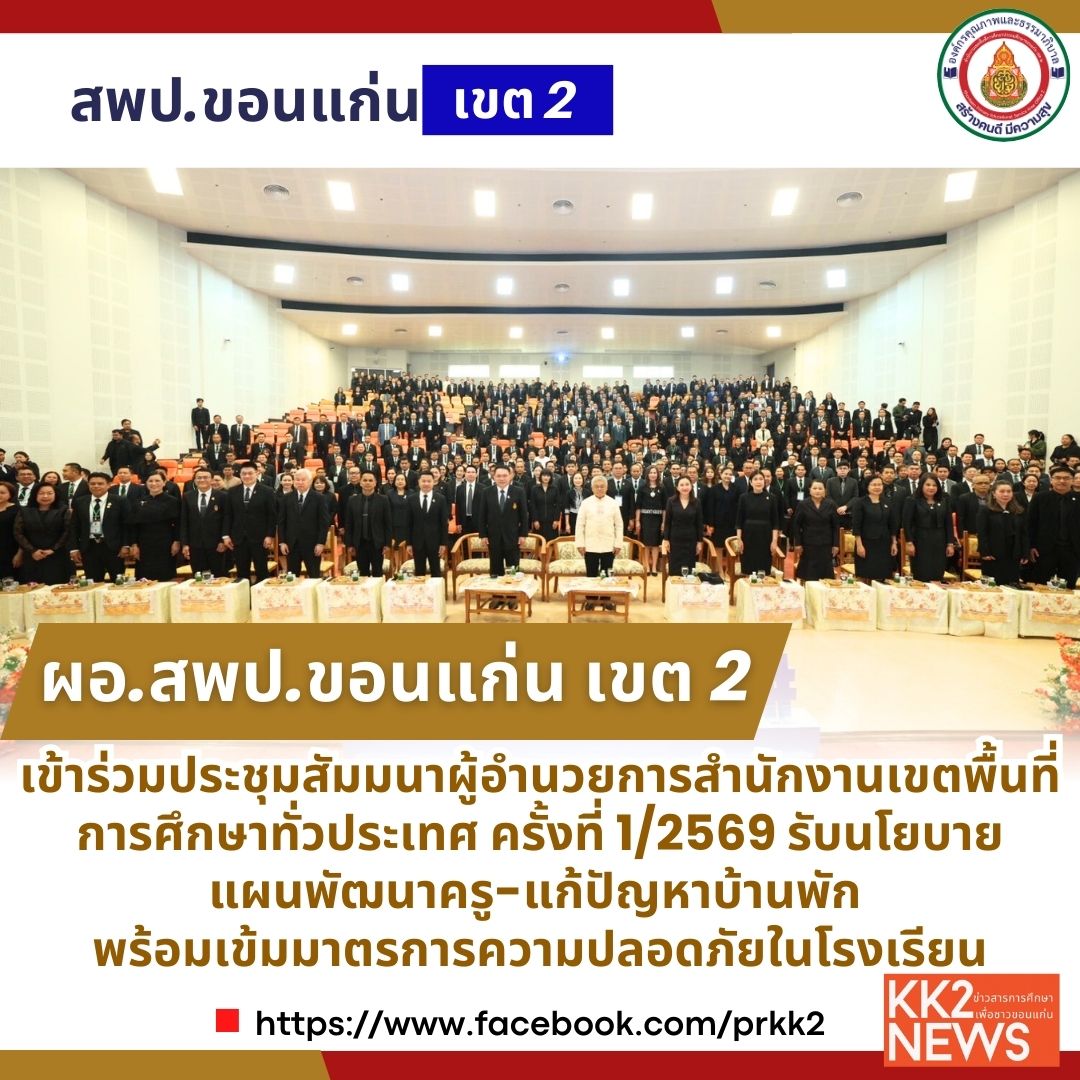 ผอ.สพป.ขอนแก่น เขต 2 เข้าร่วมประชุมสัมมนาผู้อำนวยการสำนักงานเขตพื้นที่การศึกษาทั่วประเทศ ครั้งที่ 1/2569 รับนโยบายแผนพัฒนาครู-แก้ปัญหาบ้านพัก พร้อมเข้มมาตรการความปลอดภัยในโรงเรียน
